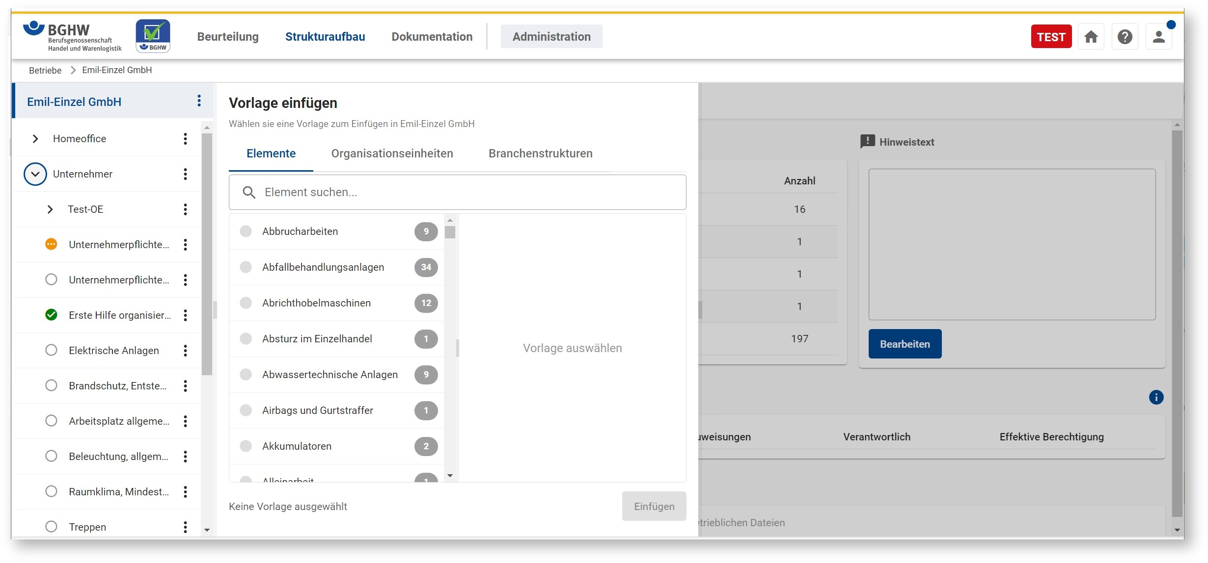 Grundlage für die Durchführung der Gefährdungsbeurteilung ist die Abbildung Ihrer Betriebsstruktur in der GBO. Über die Betriebsstruktur werden die Fragenkataloge für die Beurteilung zur Verfügung gestellt.