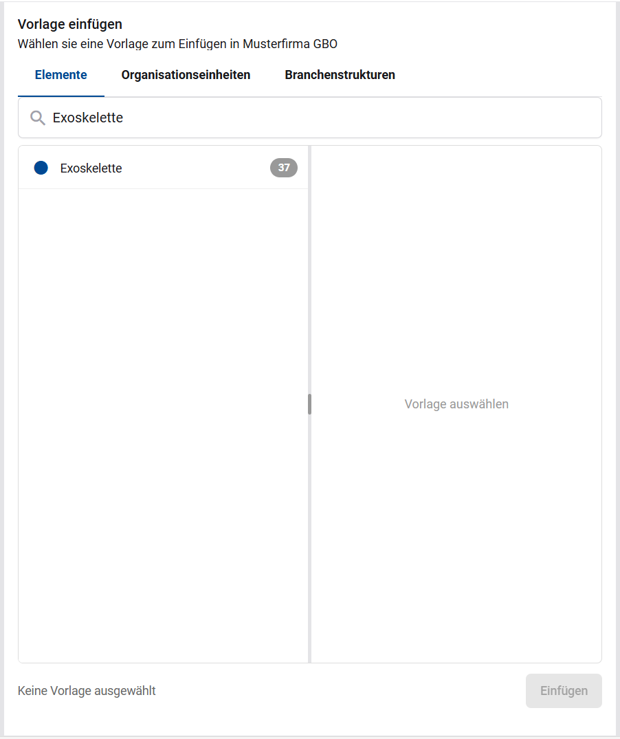 Sie können im Reiter "Strukturaufbau" über das Drei-Punkte-Menü unter "Vorlage einfügen" sich die Inhalte zu Exoskeletten in Ihre Firmenstruktur einfügen.