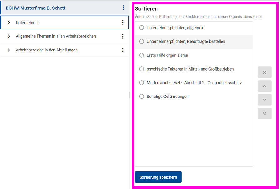 - Hier können Sie über die Pfeil-Buttons auf der rechten Seite den jeweils ausgewählten Eintrag nach oben/unten/ ganz ans Ende/ ganz an den Anfang verschieben.