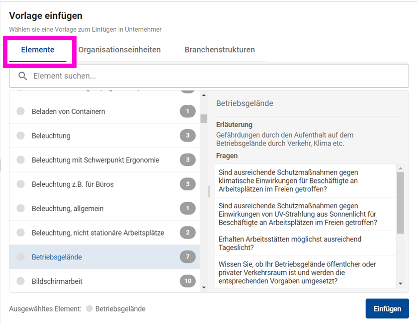 - Für das Einfügen von Elemente wählen Sie den Eintrag "Elemente" aus. Sie können hier bereits sehen wie viele und welche Fragen in den Elementen enthalten sind bevor Sie diese einfügen.