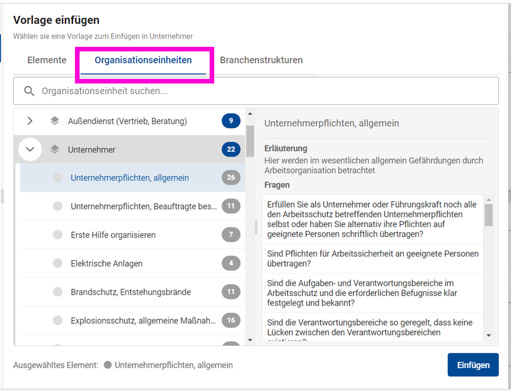 - Für das Einfügen von Organisationseinheiten wählen Sie den Eintrag "Organisationseinheiten" aus. Sie können hier bereits sehen wie viele Elemente in der ausgewählten Organisationseinheit enthalten sind und welche Fragen in den Elementen enthalten sind bevor Sie diese einfügen.