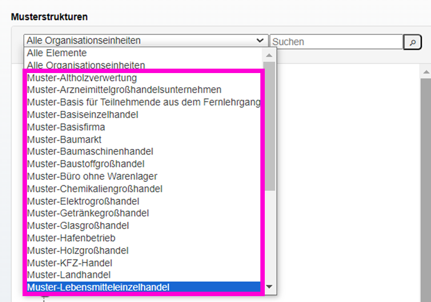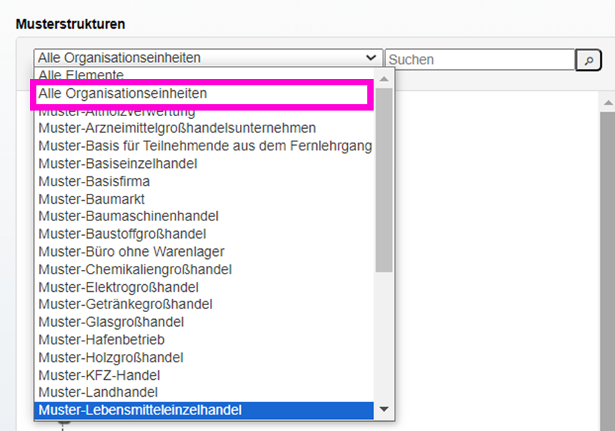 - Für das Einfügen von Organisationseinheiten wählen Sie bei den Musterstrukturen im Drop-Down Menü den Eintrag "Alle Organisationseinheiten" aus.