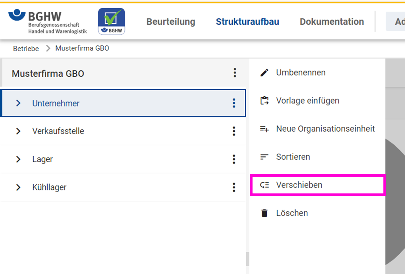 - Wenn Sie über mehrere Ebenen (Organisationseinheiten) Strukturbausteine verschieben möchten klicken Sie auf das "Drei-Punkt-Menü" neben dem zu verschiebenden Strukturbaustein.