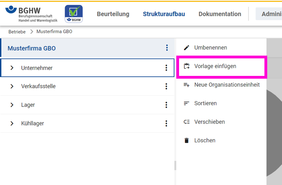- Wählen Sie den Eintrag im Strukturbaum aus in welchen Sie weitere Vorlagen einfügen wollen. Wollen Sie auf der obersten Ebene eine Vorlage einfügen dann wählen Sie ihren Firmennamen.
