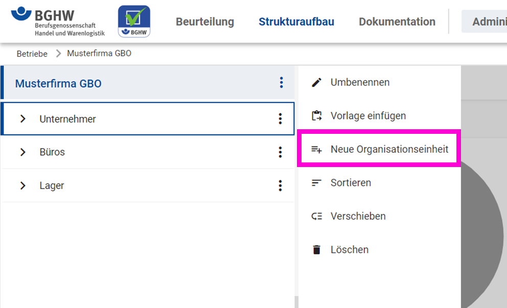 - Klicken Sie auf das "Drei-Punkte-Menü" und wählen den Eintrag "Neure Organisationseinheit".